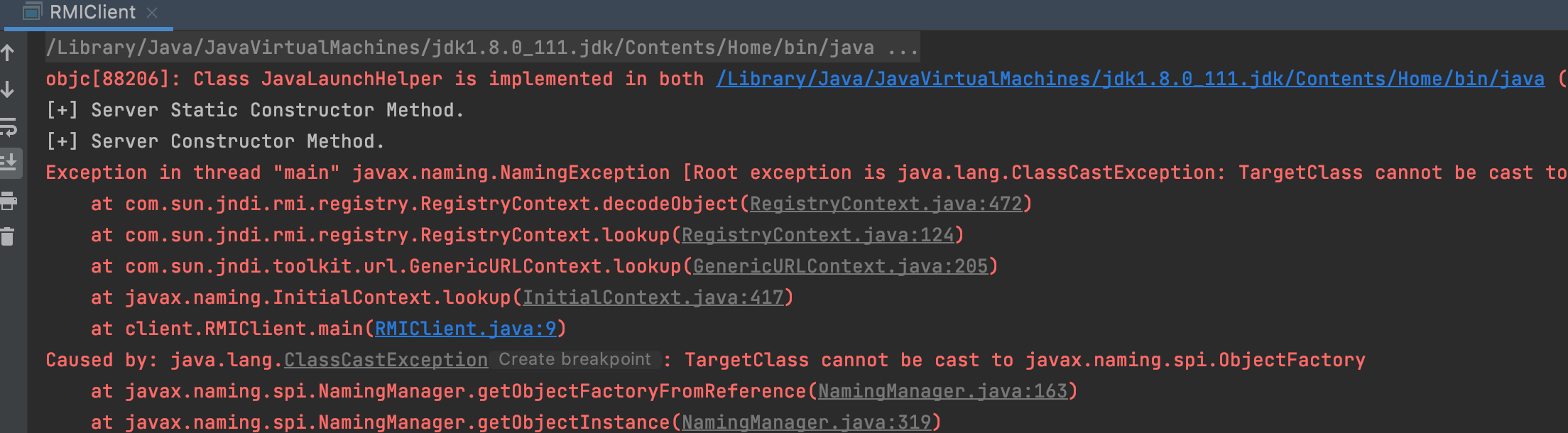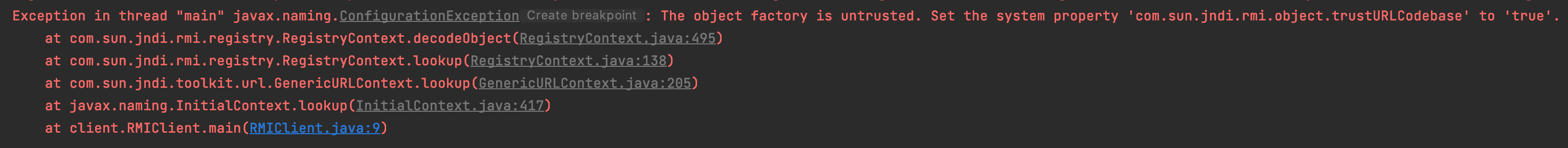在jdk>8u121的环境下使用上述RMI+JNDI时,我们发现Client报错: