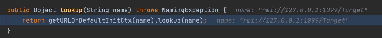开始跟进lookupInitialContext类的lookup方法首先调用了getURLOrDefaultInitCtx获取到基于URL scheme的Context,此处是基于rmi的RegistryContext