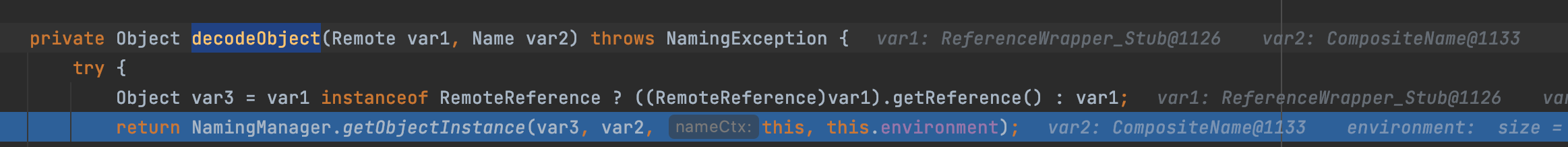 继续调用两个lookup后,来到RegistryContext类的decodeObject方法,此时Client已经获取到了目标对象的Reference