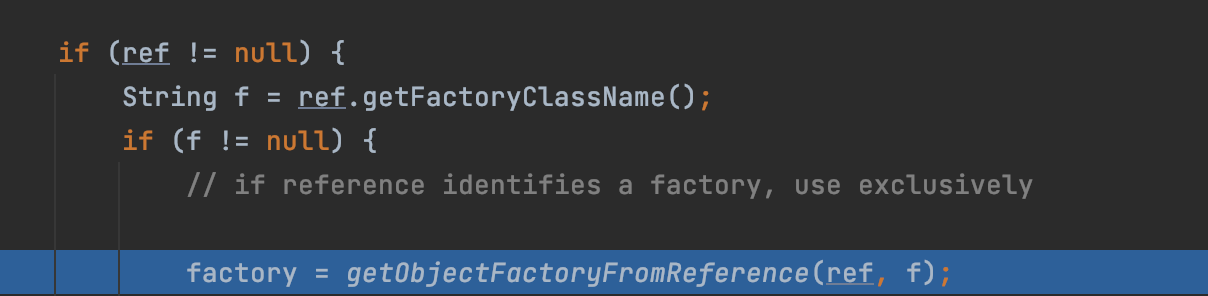 接着,在NamingManager类的getObjectInstance方法中,对Reference进行了处理,传入getObjectFactoryFromReference方法: