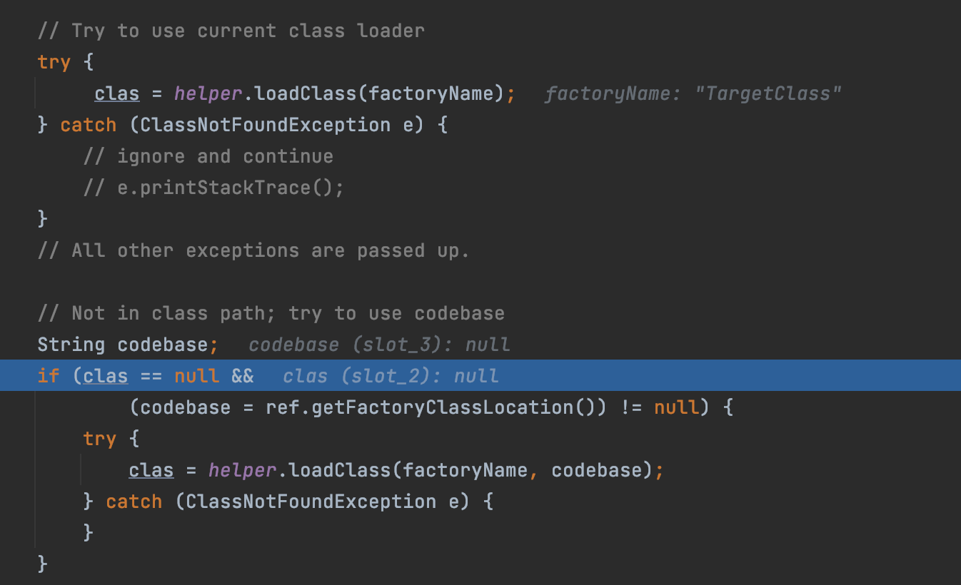 可知Client这次拿到的是本地的TargetClass。跟进,再次来到getObjectFactoryFromReference方法,发现这次程序选择了从本地进行加载: