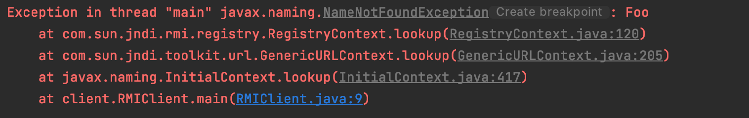 这是因为我们的RMI服务器上并未存储名为Foo的Reference