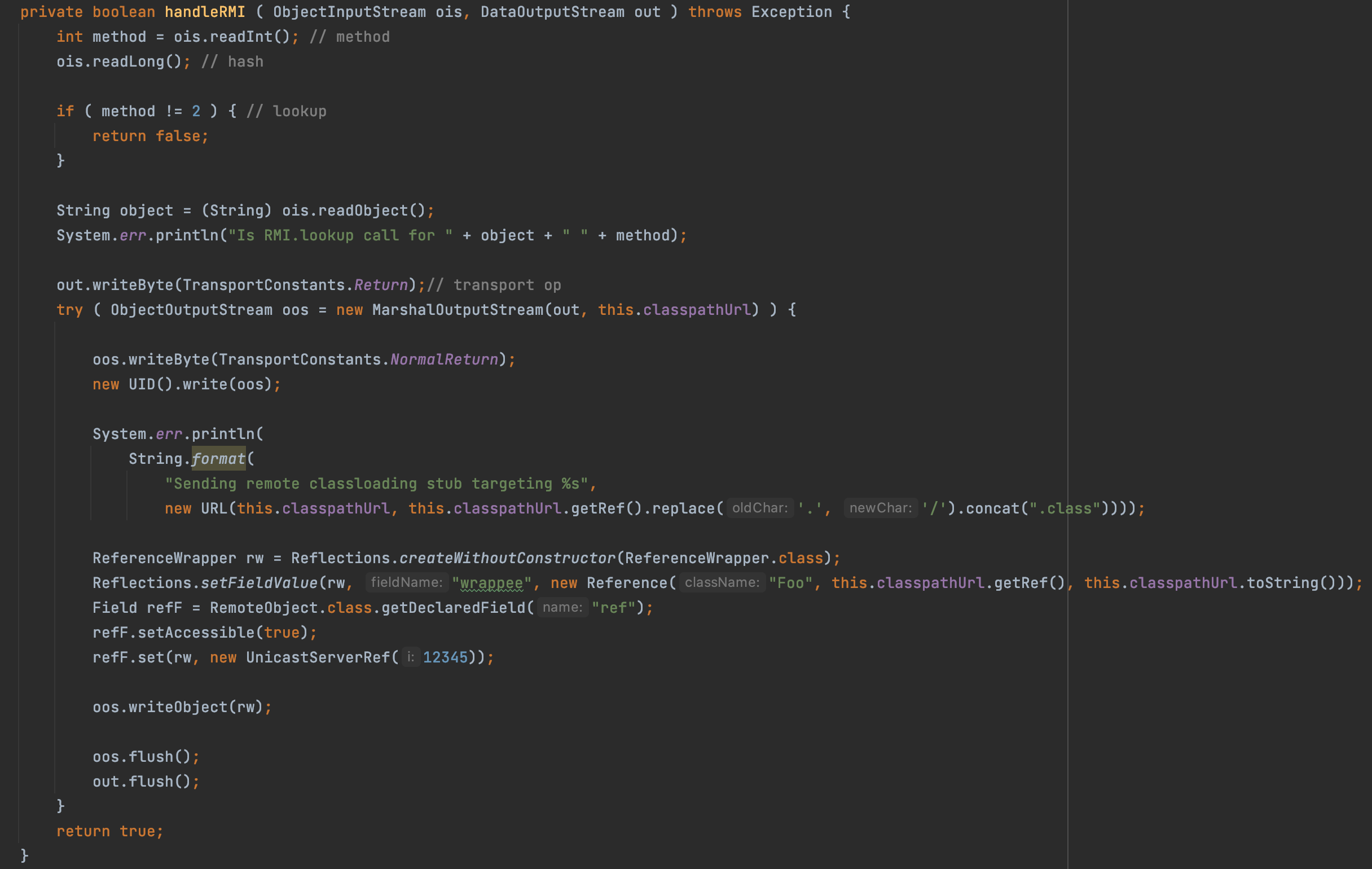 这是因为marshalsec实际上是利用socket自定义了一个RMI服务器,当收到rmi的lookup请求时,服务器会调用handleRMI方法进行处理: