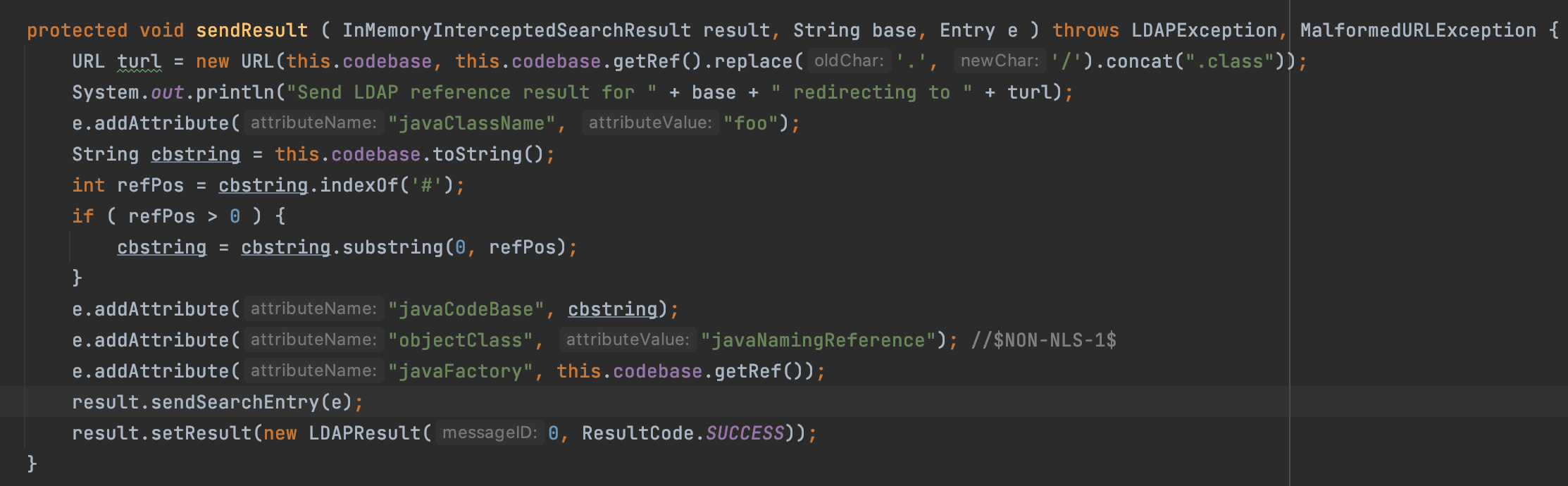 marshalsec的LDAP服务器同理,当收到ldap的lookup请求时,调用sendResult方法,返回我们设计的Reference