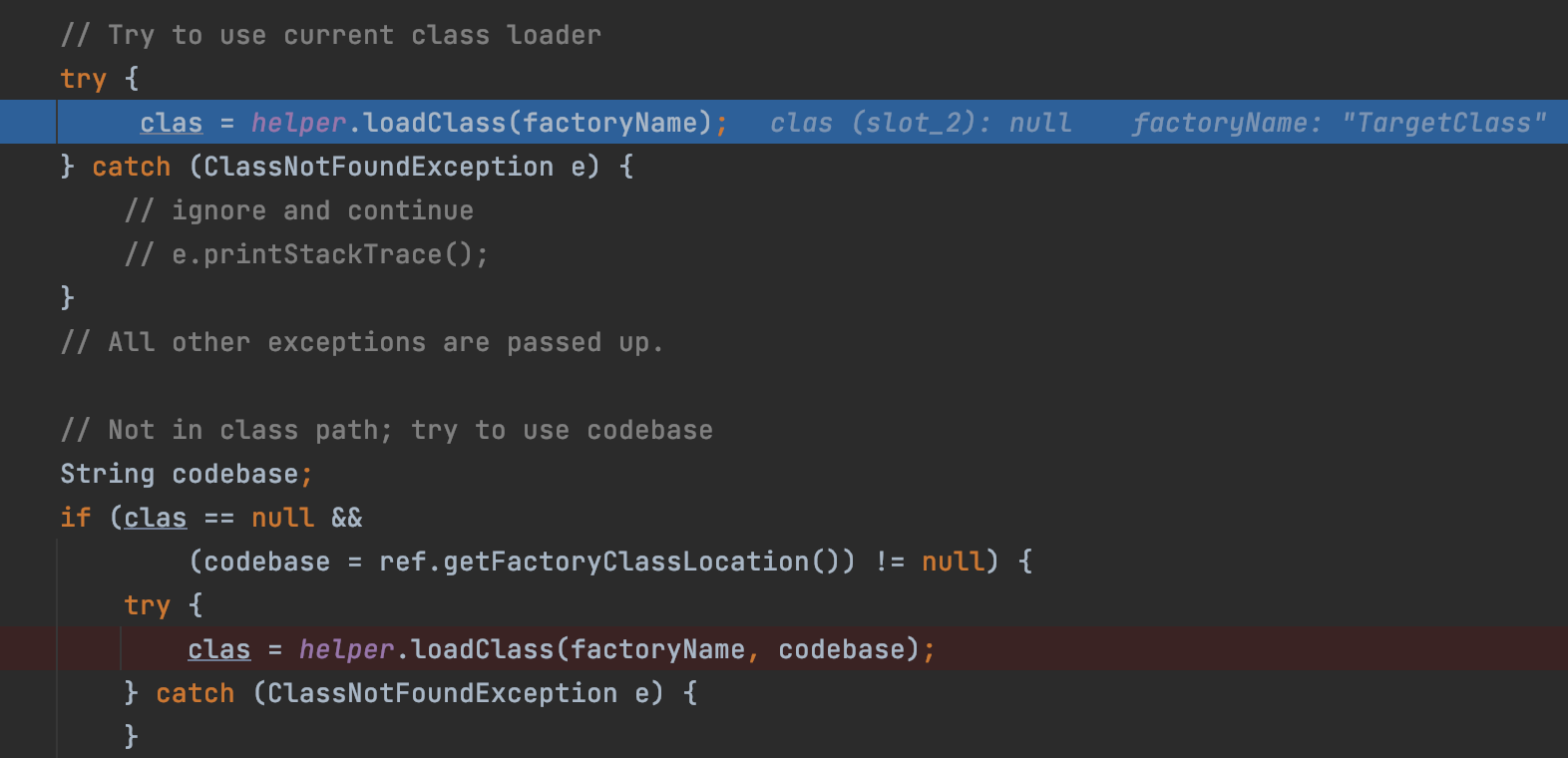 getObjectFactoryFromReference方法中,程序分别尝试了从本地和codebase两处加载TargetClass