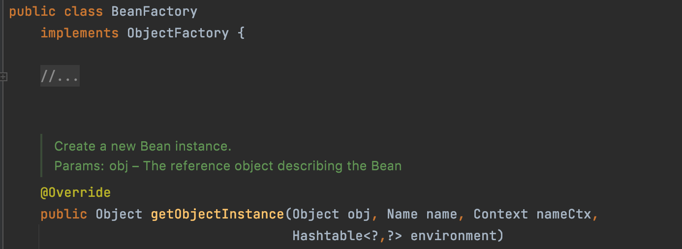 首先,这个类需要实现了ObjectFactory接口和getObjectInstance方法,在Apache Tomcat中,我们找到了符合条件的org.apache.naming.factory.BeanFactory类:
