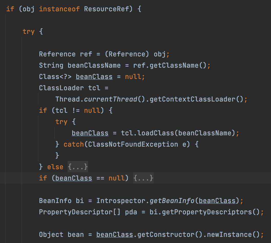 可见,它会处理ResourceRef类的Reference,加载并初始化名为ReferenceclassName字段的类。由此我们得知,className指定的类必须本地存在且有无参构造方法。