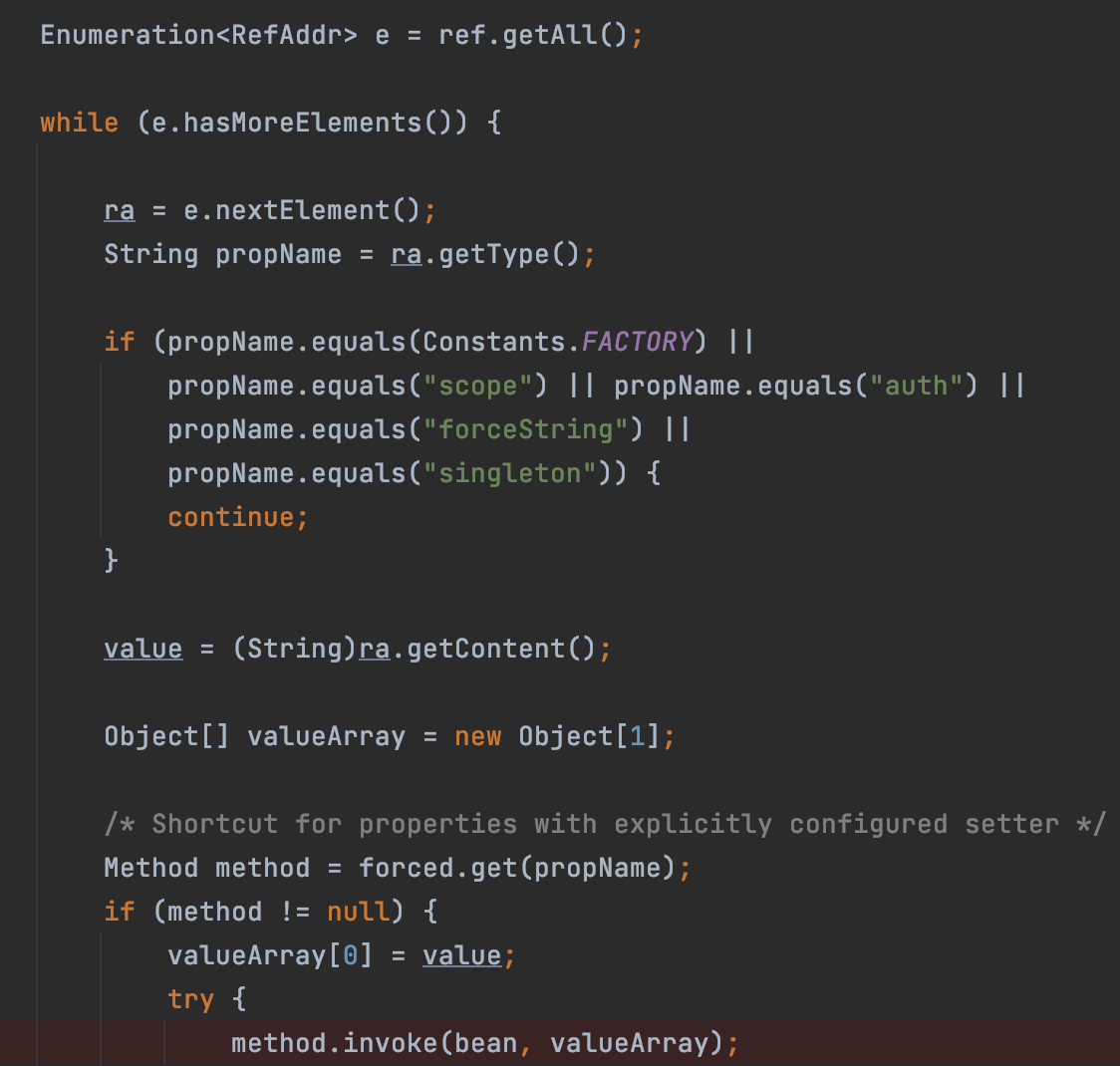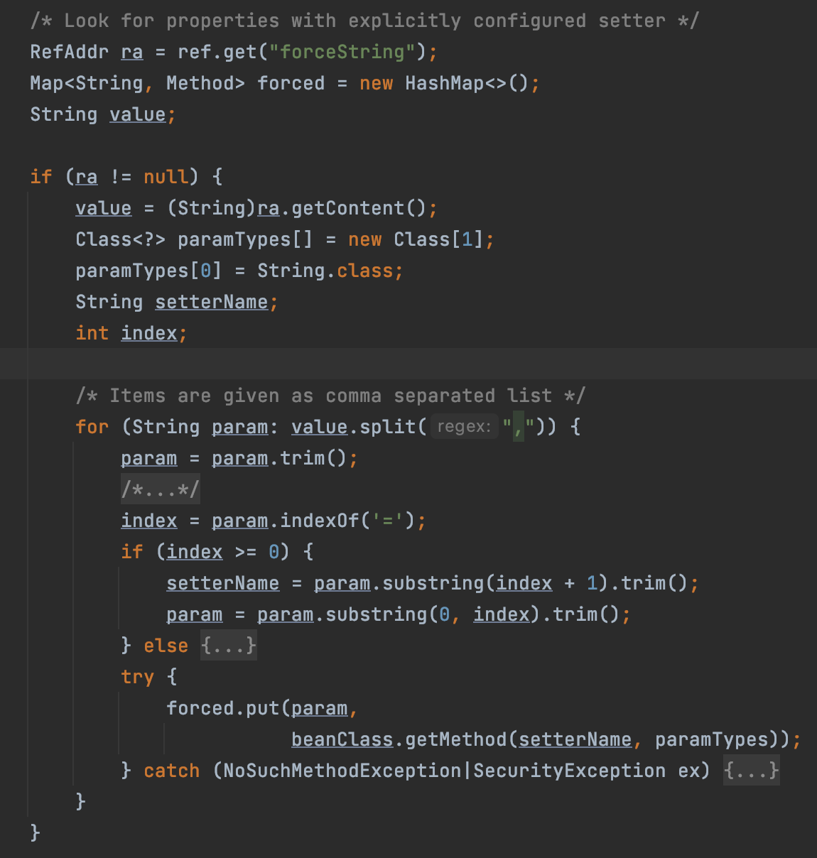 这一段,我们了解到方法获取Reference中”forceString”属性的值并用’=’进行分隔,等号左边成为哈希表forced的一个key,其value是className指定的类中名为等号右边的方法。如”forceString”为”x=y”,则”x”将存为key,value为y方法。注意,此方法的参数paramTypes为一个String类型,所以我们要找的className指定的类中需要有这样一个方法。