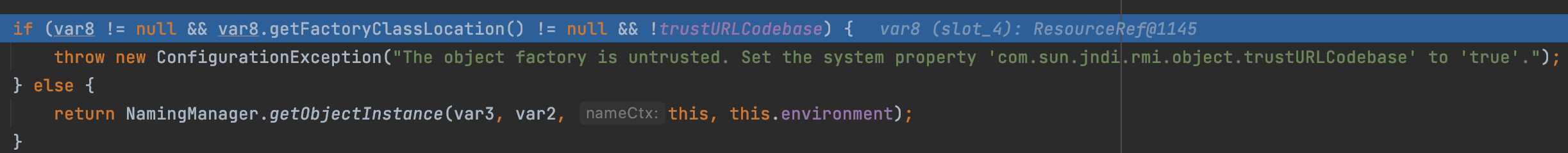 RegistryContext类的decodeObject方法中,对trustURLCodebasetrueorfalse进行了检查。观察判断条件,我们可以通过设置ReferencefactoryLocation,也就是codebase,为null的方式进行绕过,从而成功进入getObjectInstance方法。