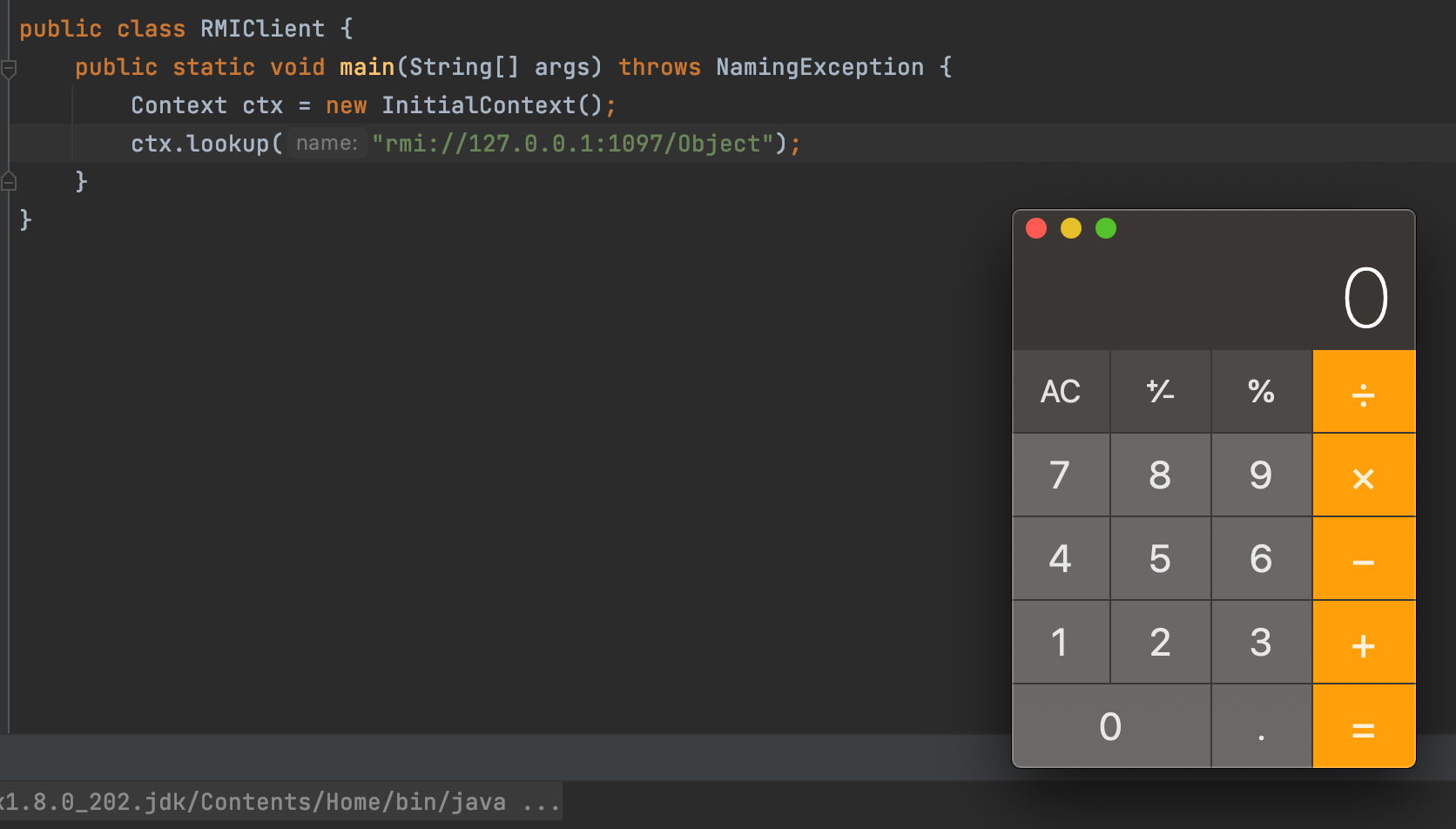 注意,Client与TargetClass需要在不同的project中,后面会同本文开头的“不严谨”一起给出解释。这里我们使用InitialContext类的lookup方法向RMI系统进行查询。