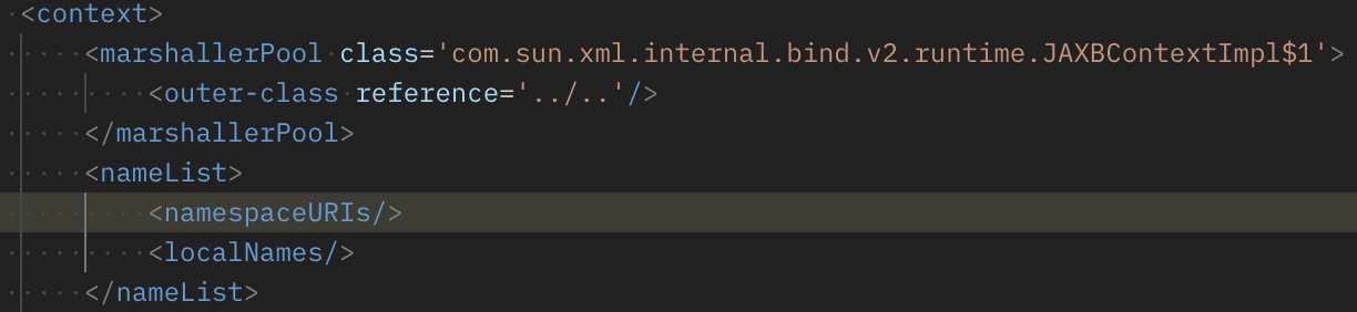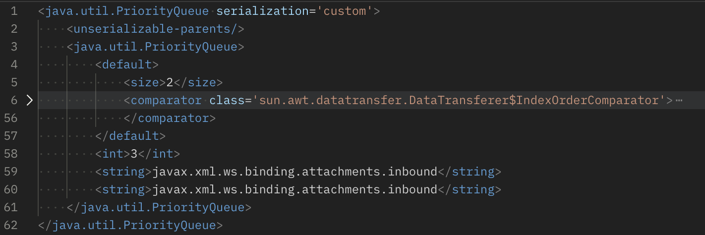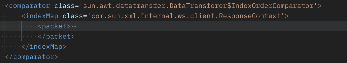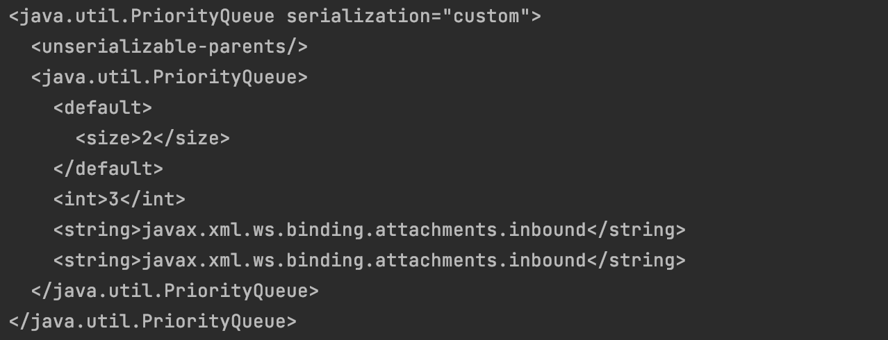 最外层,是java.util.PriorityQueu类,一个借助其comparator进行排序的优先级队列。可知它实现了Serializable接口并重写了readObject方法。<default>标签下,是该类的两个属性size和comparator。最下面的便是队列中的两个字符串元素”javax.xml.ws.binding.attachments.inbound”。