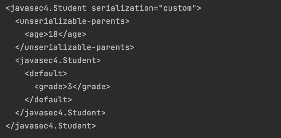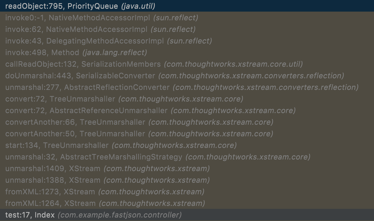 可以注意到两点,对于实现了Serializable接口并重写了readObject方法的类,其序列化后的XML会新增serialization="custom"字段,同时,类似于fastjson反序列化过程中类的getter和setter方法会得到执行,XML反序列化过程中,类重写的readObject会被执行。