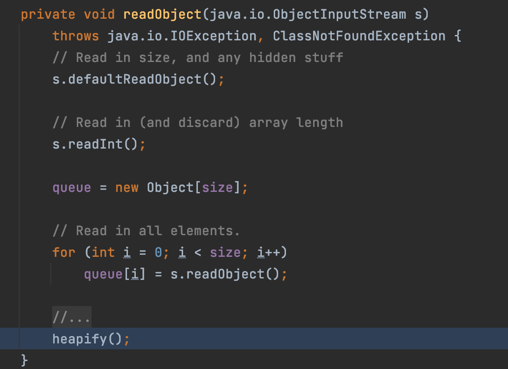 对PriorityQueue而言,一个序列化后的队列字符串,反序列化要做的就是重新排序,对应readObject的heapify方法: