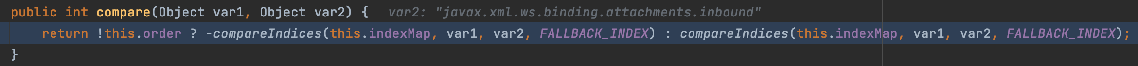 排序的标准便是前文提及的comparator,此处为sun.awt.datatransfer.DataTransferer$IndexOrderComparator类,常用于应用间通信。其compare方法,排序的对象便是两个”javax.xml.ws.binding.attachments.inbound”字符串:
