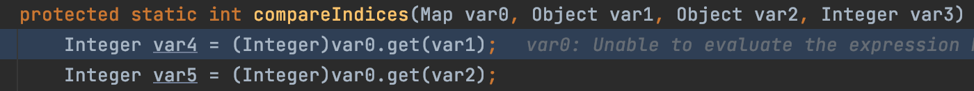 同时,可见排序传入了DataTransferer$IndexOrderComparator类的indexMap,此处为com.sun.xml.internal.ws.client.ResponseContext类,顾名思义,它是通信中response报文的信息。在该comparator中,对两个元素的比较是通过比较二者在indexMap中的索引来实现的。在compareIndices方法中,调用get获取了元素的索引: