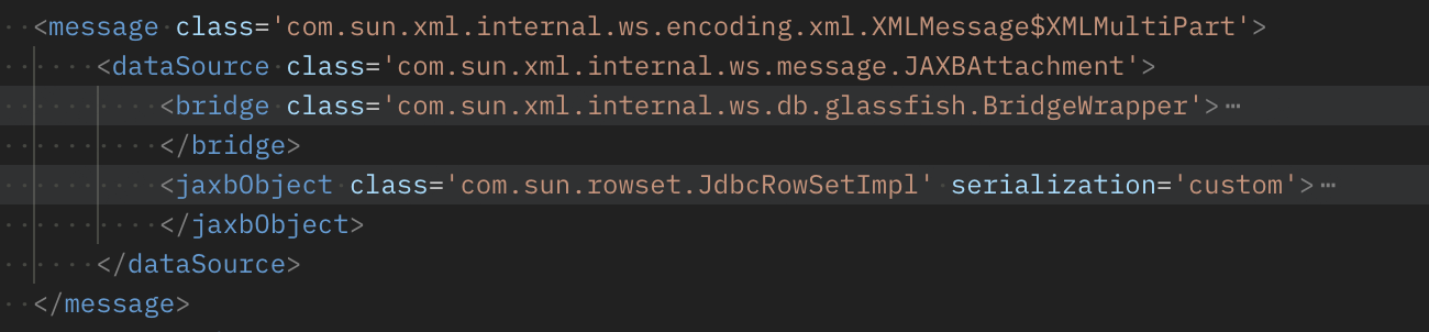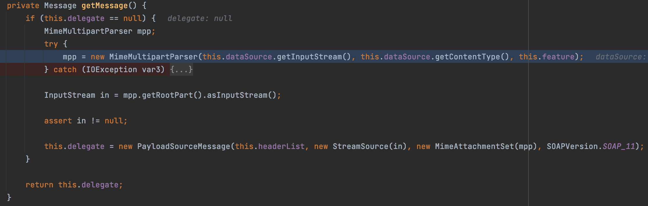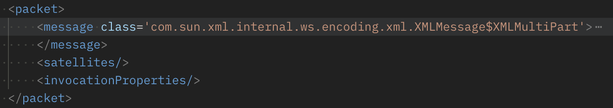 其中,对packet的message,此处为com.sun.xml.internal.ws.encoding.xml.XMLMessage$XMLMultiPart,一个MIME类型的XML,进行了剖析。接下来,我们把注意力集中到message上,POC部分如下: