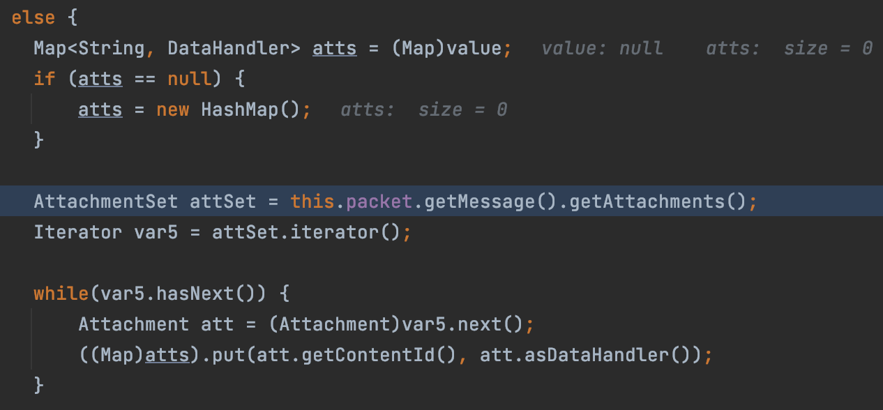 对照POC,并无satellites,可以理解为并没有集成其他报文的属性。同理,也无else if中的handlerScopePropertyNames,因此进入else部分。这里的判断if (!key.equals("javax.xml.ws.binding.attachments.inbound"))表明了为什么PriorityQueu中的元素需要是”javax.xml.ws.binding.attachments.inbound”,而inbound message,实际上指来自移动设备的消息。于是来到最后的else: