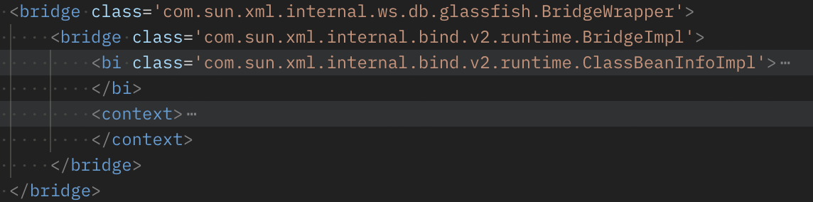 对照POC,我们看到这里的jaxbObject是上章用到过的JdbcRowSetImpl类,它的详细构造我们等下来看。这里,我们先保持思路跟进封装了一系列序列化操作的bridge,此处为com.sun.xml.internal.ws.db.glassfish.BridgeWrapper的com.sun.xml.internal.bind.v2.runtime.BridgeImpl类: