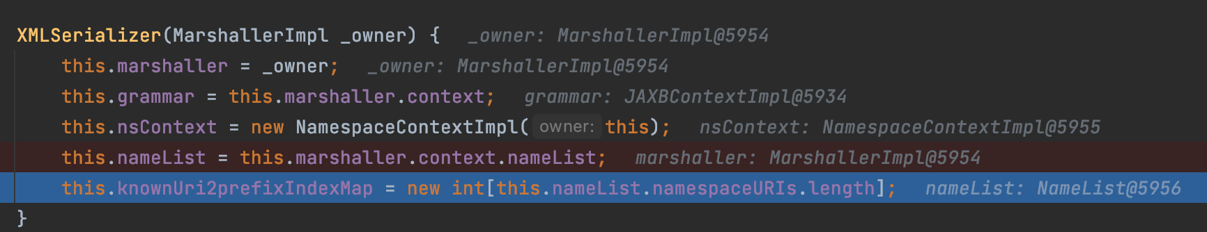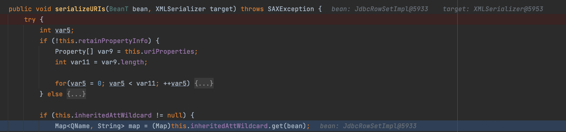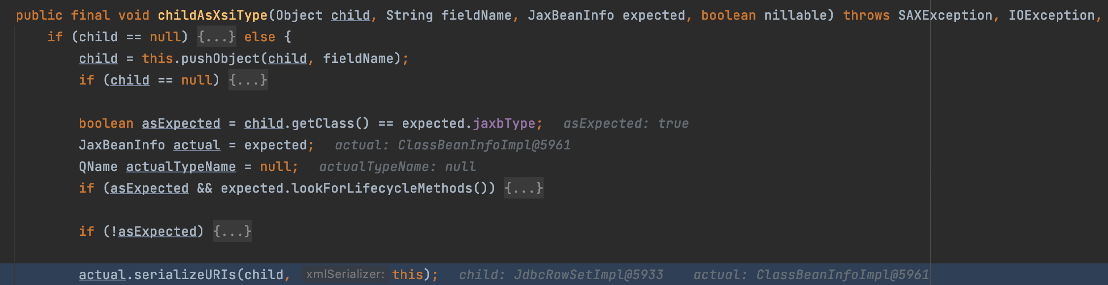 其中,比较完<jaxbType>与child,即JdbcRowSetImpl,的异同后,调用了actual,即POC中构造的bi:ClassBeanInfoImpl,的serializeURIs方法对JdbcRowSetImpl进行序列化:
