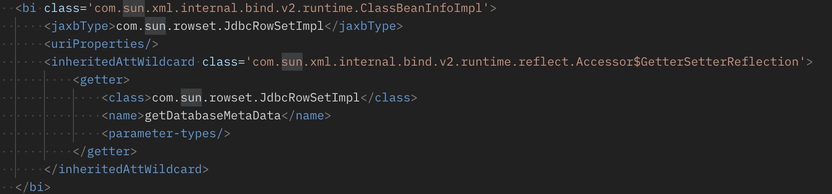 这里我们看到<uriProperties>是不可或缺的。接着,调用了inheritedAttWildcard的get方法,此处为com.sun.xml.internal.bind.v2.runtime.reflect.Accessor$GetterSetterReflection,顾名思义,用于反射访问类的getter和setter。而这里的get,反射调用了JdbcRowSetImpl的getter方法: