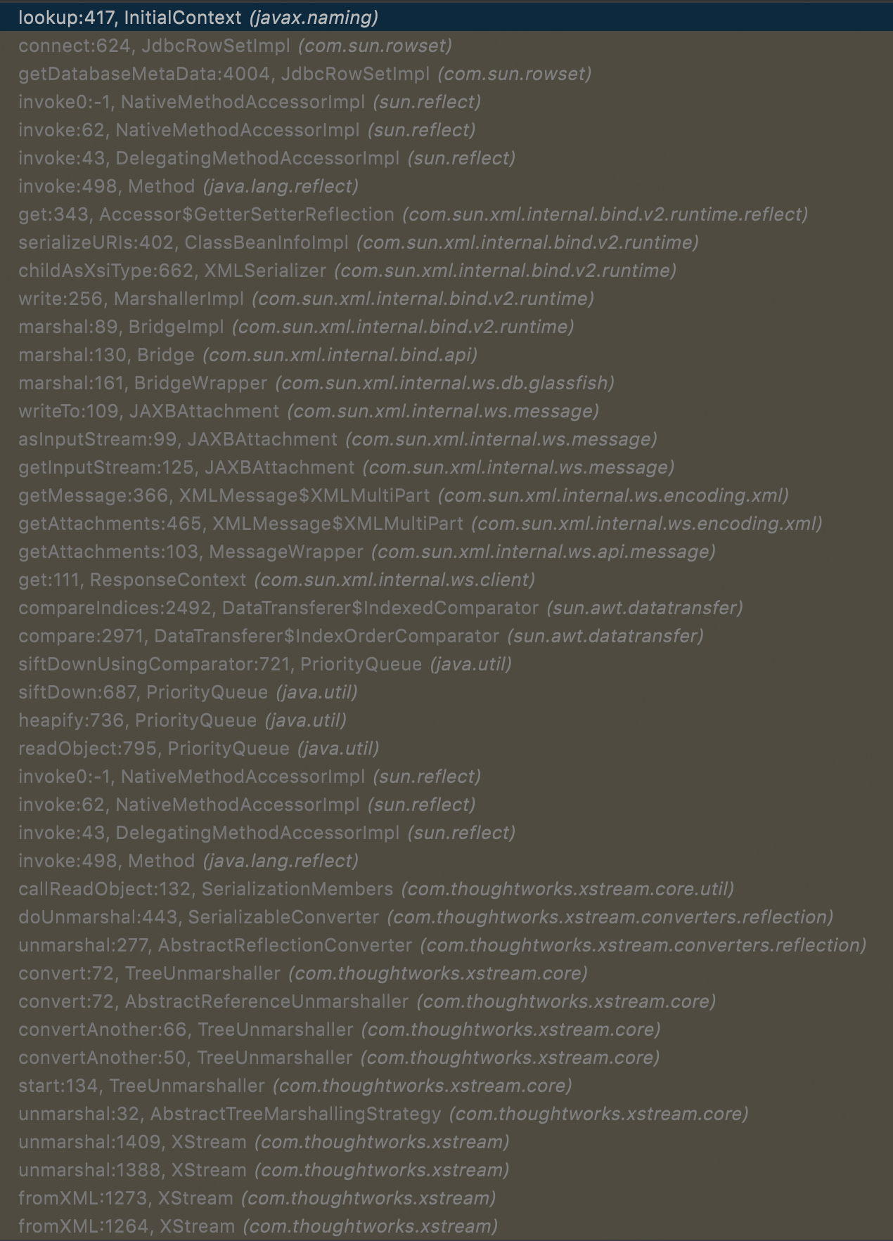 总结一下,CVE-2021-21344的关键词有两个,PriorityQueue和JAX-WS (Java API For XML-WebService)。首先,XStream反序列化时,进入了PriorityQueue的反序列化方法,接着,借助JAX-WS的相关类,对XML再次进行了序列化,从而触发了JNDI注入。