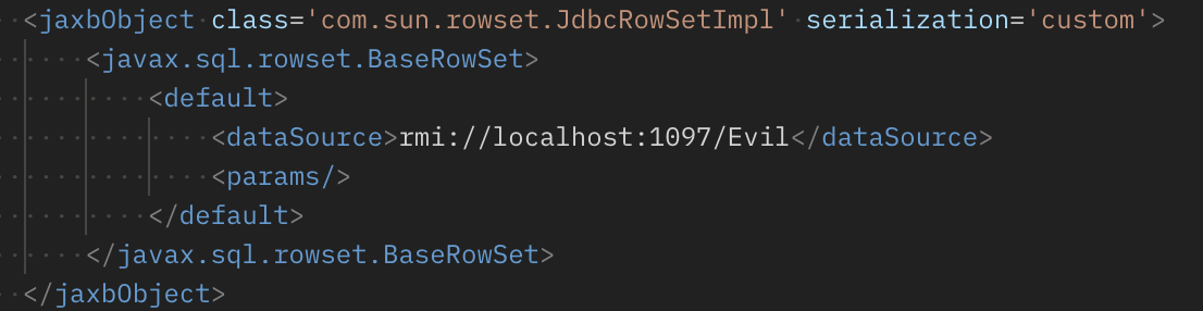 其中,t为JdbcRowSetImpl类,m为刚刚构造的Marshaller,而bi,此处为com.sun.xml.internal.bind.v2.runtime.ClassBeanInfoImpl,继承自com.sun.xml.internal.bind.v2.runtime.JaxBeanInfo,封装了具体到某一类的序列化操作。看下POC: